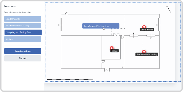 Easily define and place specific functional Locations (e.g., Kitchen Prep Area, Ingredient Storage, Quality Control Lab, Equipment Washing Bay) directly onto the floor plan using an intuitive drag-and-drop tool.