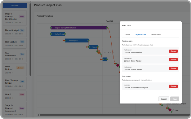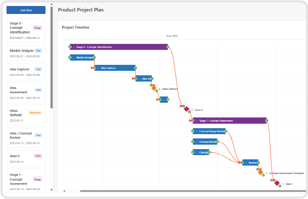 Define and sequence your entire project using core building blocks: Stages, Tasks, Milestones, and Go/No-Go Gates.